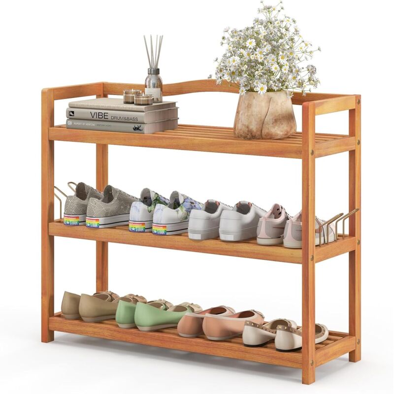 Costway étagère chaussure à 3 niveaux en bois d’acacia pour 12 paires, crochets métalliques latéraux (marron)
