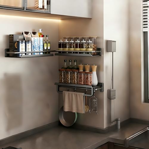Giural Gris,30cm,Étagère à Épices Murale, Rangement Epices Cuisine Suspendue, Etagere Cuisine avec Crochets Et Porte-Rouleau De Cuisine, Porte Épices Cuisine pour Épices, Canettes, Pots