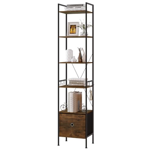 WOLTU Bibliothèque Étagère Rangement, Étagère d'angle à 5 Niveaux, avec 1 Tiroir, 40x30x187cm, Cadre en Métal, Marron Rustique+Noir, RGB63vbn