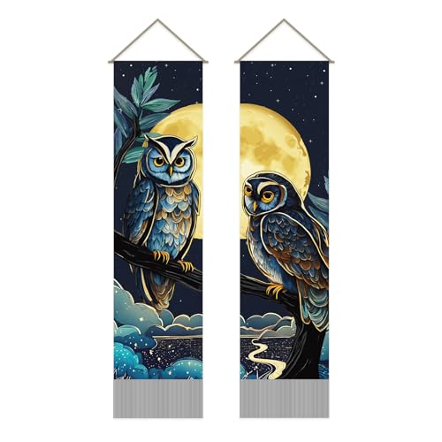 AHANDMAKER Lot de 2 Tapisseries de Chouettes Nocturnes, Tapisserie de Nuit de Pleine Lune, Mystique Chouette dans une Nuit Lumineuse, Tapisserie à Franges, Décoration Murale pour Art de la Chambre