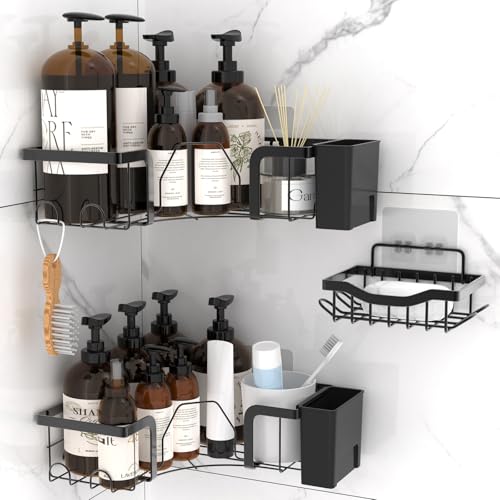 VILCEN Étagère de Douche sans Percage, Etagere Salle Angle de Bain, Rangement Douche pour Nettoyant pour Corps de Shampoing, 4 pièces Etagère Douche Angle, Noir