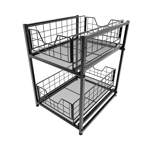Hykiee Rangement sous Évier Cuisine, Acier Inoxydable Rangement et Organisation de Cuisine avec 2 Tiroir Coulissant, Hauteur réglable Stable Meuble Étagère de Rangement Placard Organisateur
