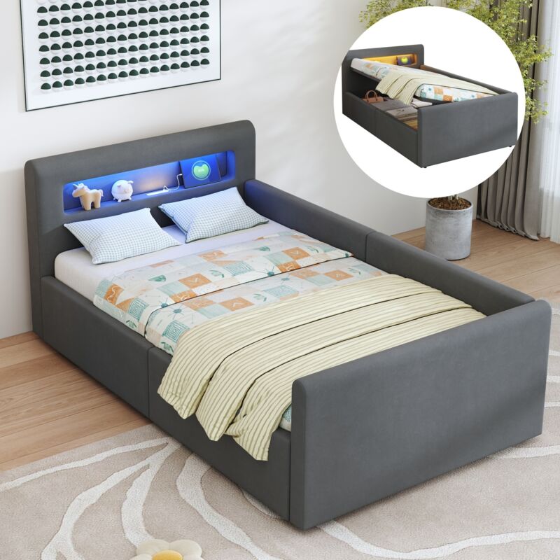Lit simple 90x200 cm, lit coffre 90x200 cm, avec éclairage LED, port de charge USB, étagère, velours, lit enfant - Gris foncé