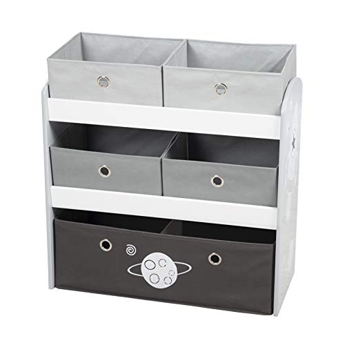 roba Étagère pour Jouets Enfant en Bois Rakete - 5 Paniers en Tissu Amovibles - Meuble de Rangement pour les Jouets - 64 x 30 x 60 cm - Motif Fusée - Gris / Noir