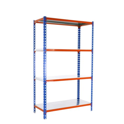 Simon Rack Étagère Rangement et 4 Niveaux, 180 kg Capacité de Charge et Point de Flexion, 1500x900x300 mm, Étagère Charge Lourde, Étagère Garage, Bleu/Orange/Galvanisé - Simonclick