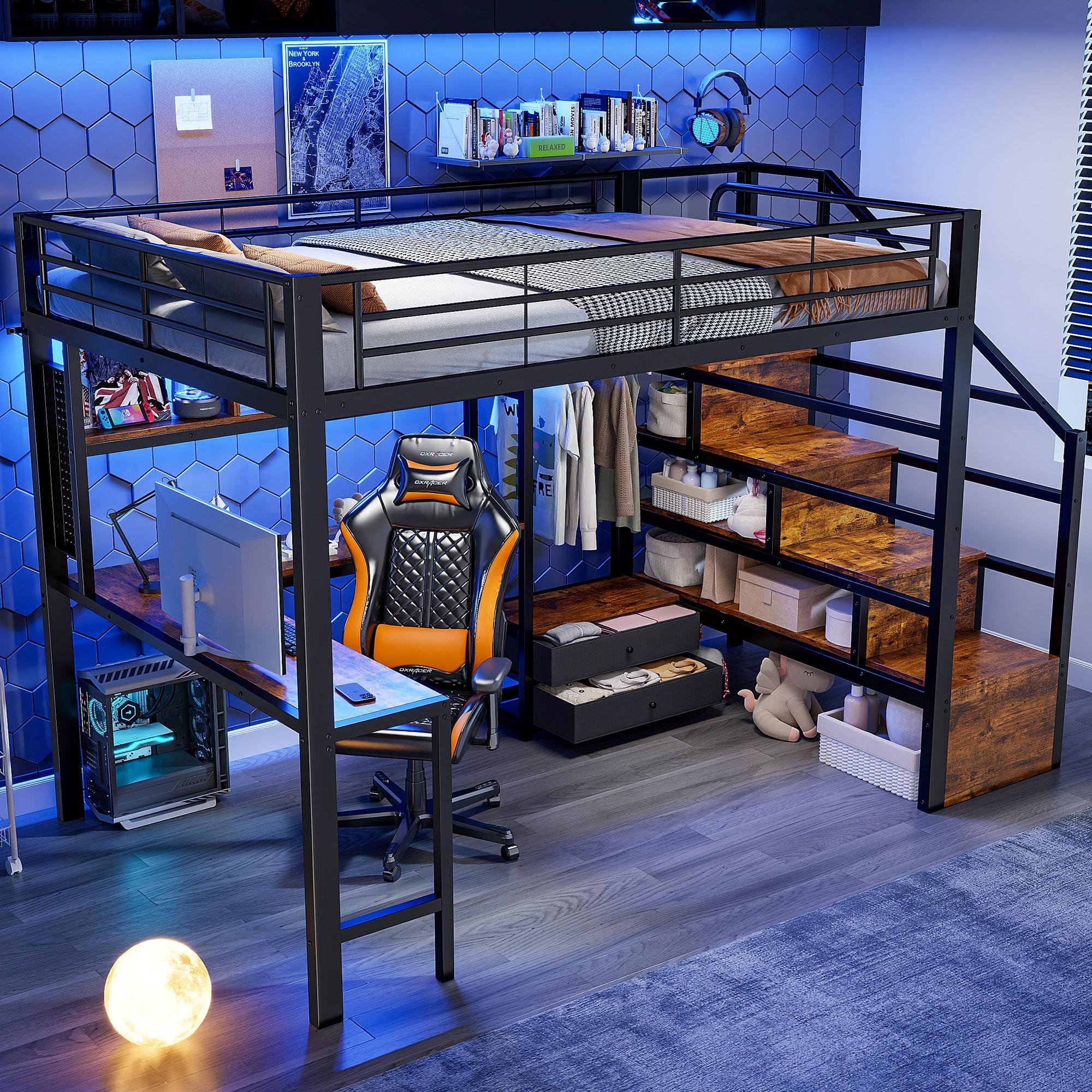 Zepneiy Lit Mezzanine 2 Places 140x200 avec LED et USB, Lit Enfant en Métal avec Bureau et étagère, Lit Mezzanine Enfant avec Console d'ordinateur et Escalier, Lit en Hauteur Structure en Fer, Noir