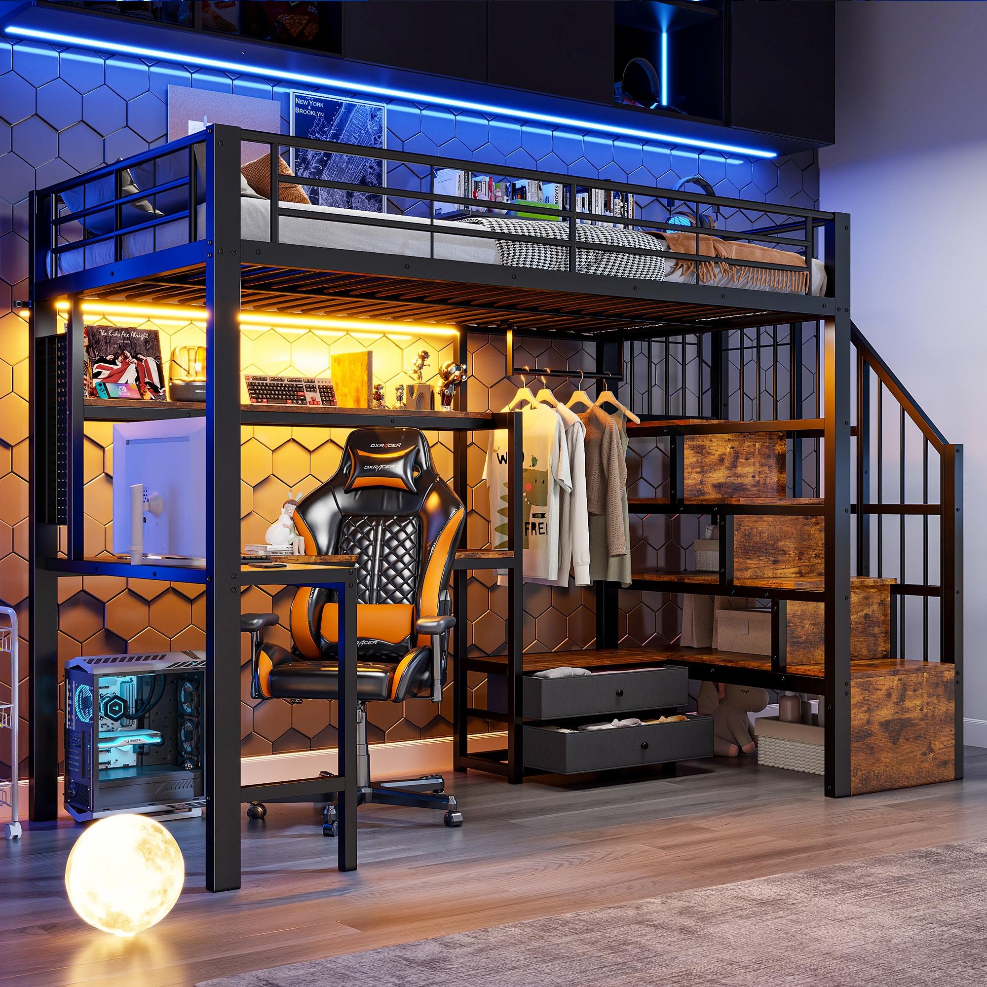 Lit superposé Flieks 140 x 200 cm avec bureau et étagère, lit mezzanine avec LED, lit enfant avec tringle à vêtements et escalier de rangement, lit superposé noir