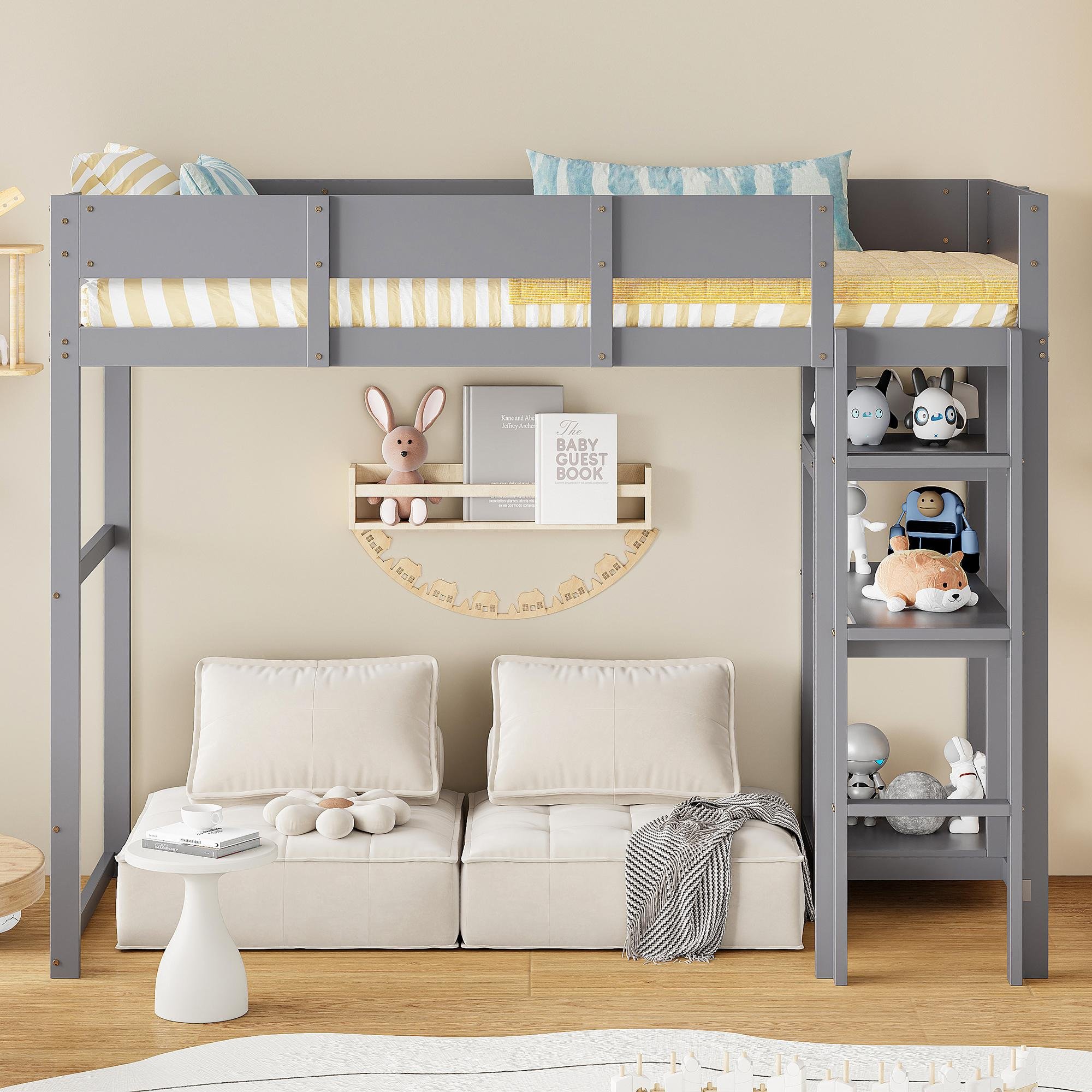 Lit superposé Flieks 90 x 200 cm avec étagère et rangements, lit mezzanine avec barrière de sécurité, lit enfant avec sommier à lattes, lit superposé en bois avec échelle, gris