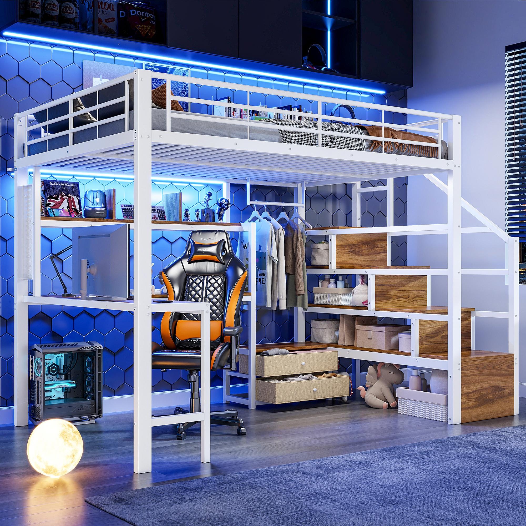 Lit superposé Flieks 140 x 200 cm avec bureau et étagère, lit mezzanine avec LED, lit d'enfant avec tringle à vêtements et escalier de rangement, lit superposé blanc