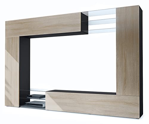 Vladon Meuble TV Mural Mirage, Ensemble étagère TV avec Panneau arrière et 2 Portes, 2 clapets et 6 étagères en Verre, Noir Mat/Chêne Brut (262 x 183 x 39 cm)