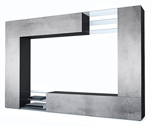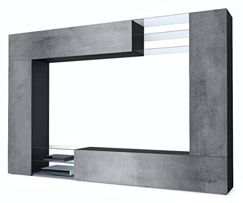 Vladon Meuble TV Mural Mirage, Ensemble étagère TV avec Panneau arrière et 2 Portes, 2 clapets et 6 étagères en Verre, Noir Mat/Aspect Béton Foncé (262 x 183 x 39 cm)