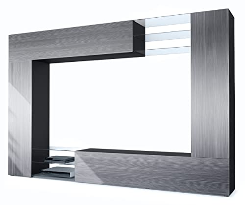 Vladon Meuble TV Mural Mirage, Ensemble étagère TV avec Panneau arrière et 2 Portes, 2 clapets et 6 étagères en Verre, Noir Mat/Gris Haute Brillance (262 x 183 x 39 cm)