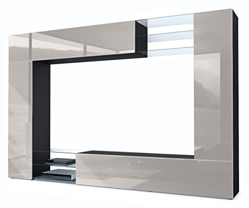 Vladon Meuble TV Mural Mirage, Ensemble étagère TV avec Panneau arrière et 2 Portes, 2 clapets et 6 étagères en Verre, Noir Mat/Gris Sable Haute Brillance (262 x 183 x 39 cm)