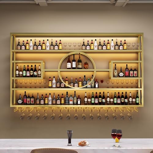 Porte-Bouteilles Muraux Industriels, étagères flottantes pour unité de Bar avec lumière LED, étagère flottante murale pour bar, étagère flottante murale de bar avec porte-verres(Gold,200cm/78.7in)