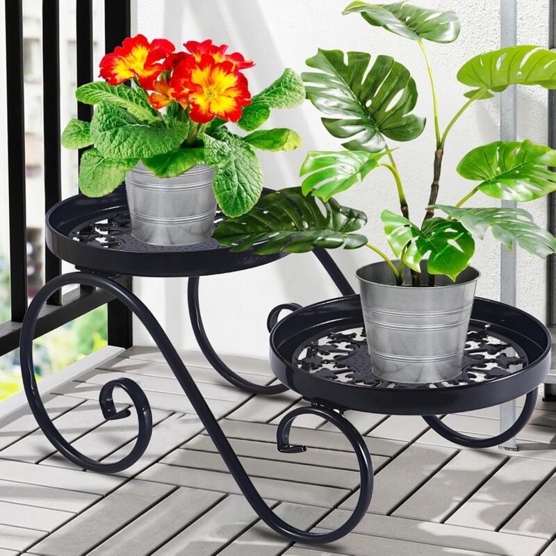 2 Niveaux Noir Support Plantes Interieur, Métal Porte Plante, Antirouille Etagere Plantes Interieur Exterieur, Supports de Pots de Fleurs pour