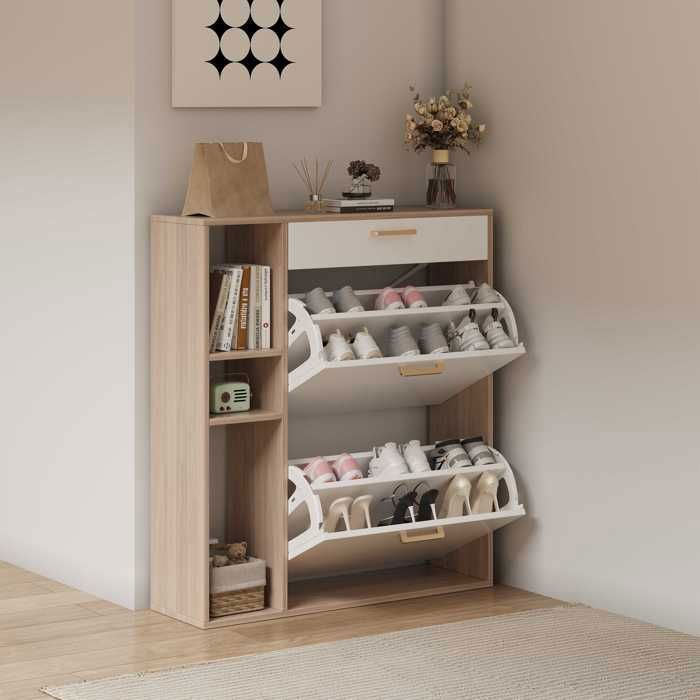 Meuble à Chaussures avec 2 tiroirs rabattables-Armoire à chaussures avec étagère réglable-Rangement à Chaussure en bois-12à