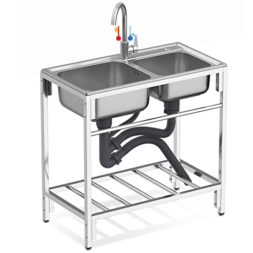 ZQFHSX Évier Utilitaire sur Pied à Une cuve en Acier Inoxydable avec Robinet d'eau Chaude et Froide et étagère de Rangement pour Garage extérieur, Cuisine Commerciale, Restaurant ou buand