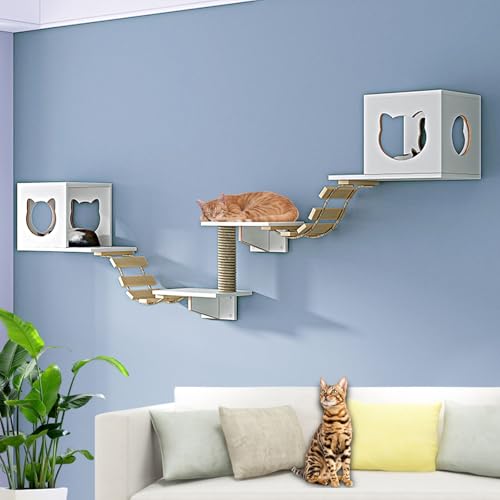 Étagère murale moderne pour chat - Plateforme élargie avec corde de chanvre - Colonne suspendue et échelle souple - Meuble mural peu encombrant pour chat d'intérieur