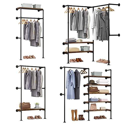 WOLTU Porte Vêtements Mural, Penderie Vêtement pour Dressing Mural, Portant à Vêtement, en Tube d’Acier, Style Industriel, Étagère en MDF,Noir+Marron Rustique