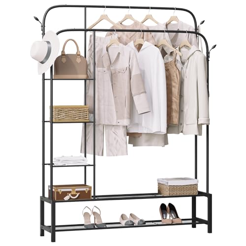 eSituro Porte-vêtements à Double Tringle, Design 4 en 1, avec Étagère à Chaussures à 2 Niveaux, Étagères Latérales à 3 Niveaux, 4 Crochets, Métal, Noir, 164x130x33,5 cm
