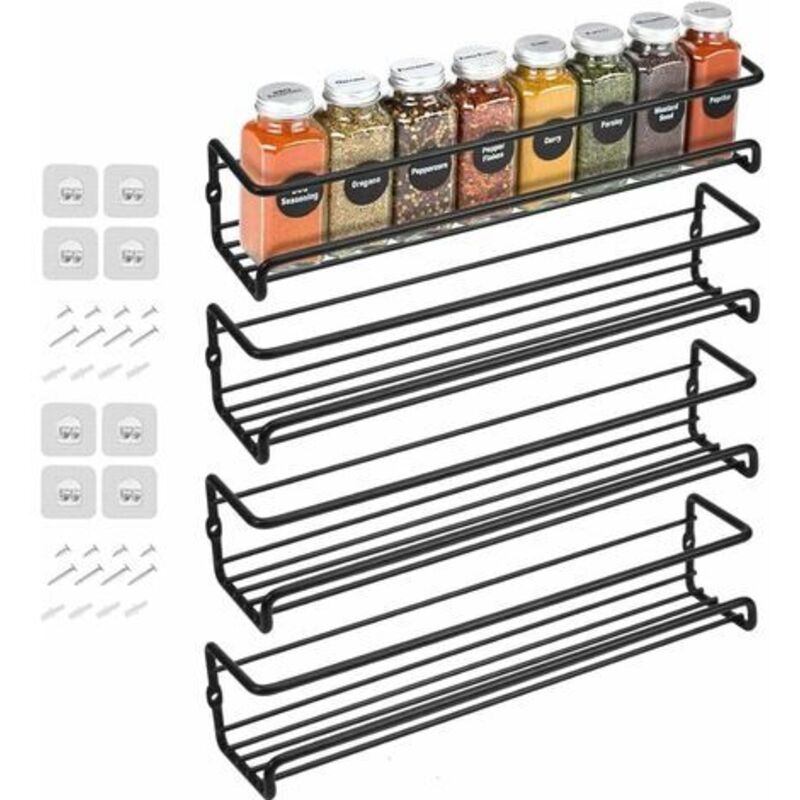 Lot de 4 étagères à épices en métal à fixation murale avec adhésif ou à visser, noir