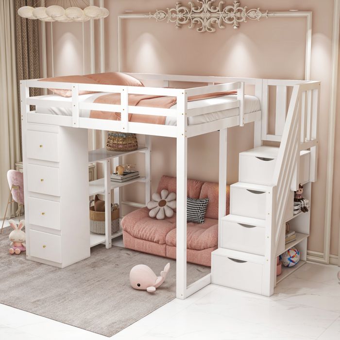 Lit mezzanine enfant 90x200 cm blanc avec armoire, bureau, étagères et escalier de rangement en bois
