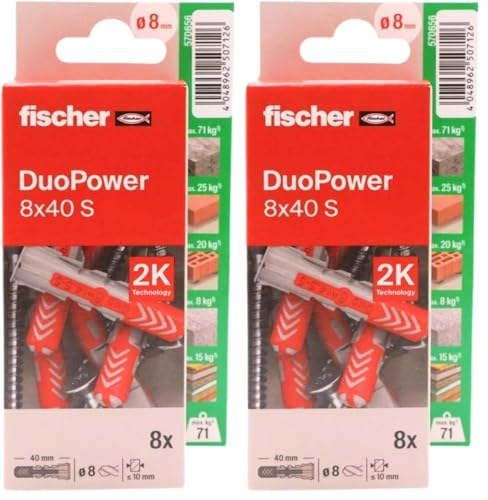 fischer - Duopower 8 x 40 avec vis - 8U, chevilles murales multi-matériaux, pour accrocher des vélos, des cadres, des armoires, des supports de télévision, des étagères, des meubles. (Lot de 2)