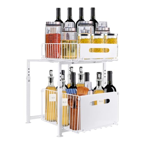 LANTUS Rangements sous Evier 2 Niveaux Organisateur Coulissant,Paniers Coulissants, Empilable,Étagères pour Placard Meuble Cuisine Salle Bain,29 x 38 x 49 cm (Blanc)