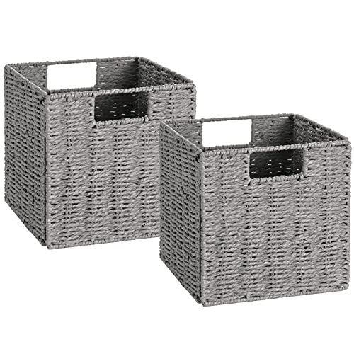 Vagusicc Lot de 2 paniers de rangement en osier tissés à la main pour étagères avec poignées – Paniers de rangement pliables pour garde-manger, chambre à coucher, organisation et décoration – Gris –
