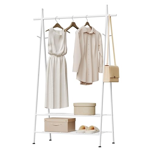 eSituro Porte-Manteau avec Tringle à Vêtements, Pendrerie Triangulaire en Tube Métallique avec 2 Étagères de Rangement, pour Chambre, Dortoir, Appartement, 106x44x161cm, en Métal, Blanc
