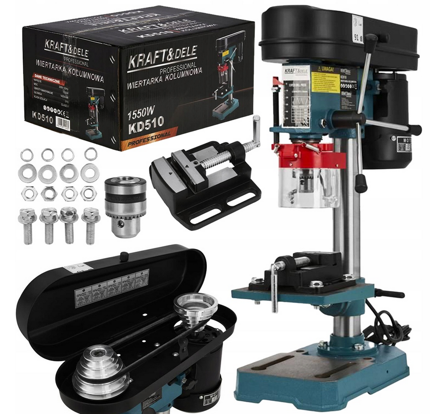 Perceuse à colonne professionnelle jusque ø 32 mm CM4 1,5 kW 230V + étau de perçage jeu de boulons jeu mêches aérosol Torros DF34M pack
