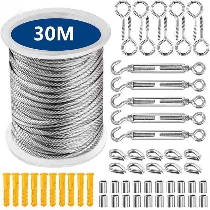Etendoir à suspendre,Cable Inox 3mm,50M/3mm Corde en Acier Inoxydable,Cable en Acier Revêtu avec Serre-Câbles,M3 Manchons,Cosses en Acier