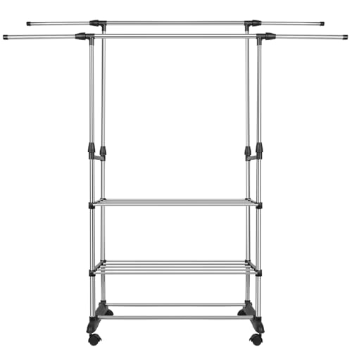 homewell Étendoir à Linge rétractable en Acier Inoxydable, Unipolaire/Bipolaire, Réglable en Hauteur, Seche Linge Etendoir pour Intérieur et Extérieur, avec Trois Niveaux de Stockage (Deux tiges)