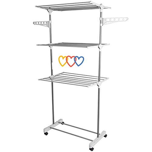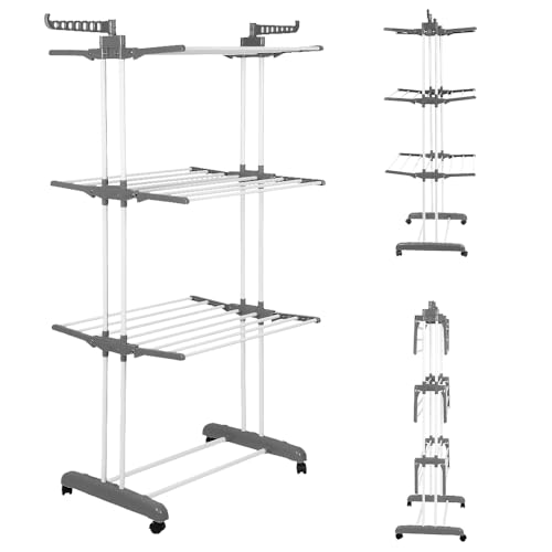haoyunlai Etendoir Linge, 3 Niveaux Grande Sechoir a Linge Pliable avec Roues, Seche Linge Etendoir pour Intérieur et Extérieur (Gris, A)
