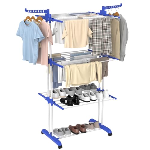 johgee Séchoir à Linge, 4 Niveaux Grande Sechoir a Linge Pliable avec Roues, Etendoir Linge intérieur, Taille 89 x 66 x 178 cm/170 × 66 × 178cm, Séchoir Linge Stable(Bleu & Blanc)