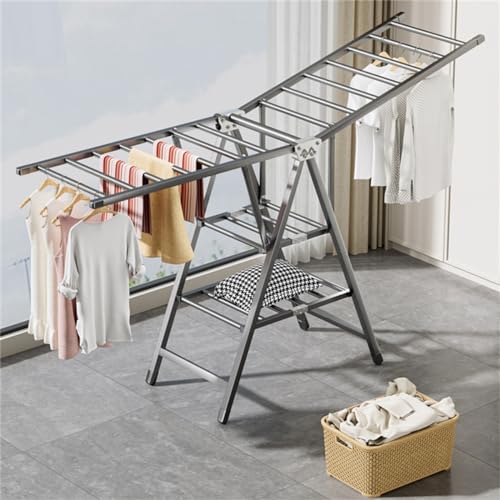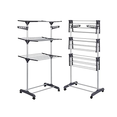 SHISHI Étendoir Linge Évolutif sur Pied, 3 Niveaux, Séchoir à Linge Pliable et Portable, Séchoir à Vêtements avec Ailes Pliable, Acier Inox et Plastique, Étendoir pour Intérieur/Extérieur, Gris-argent