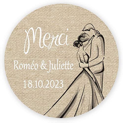 MameArt 50 STICKERS Étiquettes Personnalisées Mariage Merci Prénom, 4cm Autocollants Confiture Dragées Mariage Communion Ans Baptême Cadeaux Fête (Lin), (1FR0207A)