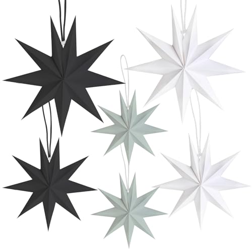 Etoile Noel Papier à Suspendre, 5 Pcs Etoile Papier Suspendre Decoration, Plafond Ornement pour Noël Décoration(Blanc Noir Gris)
