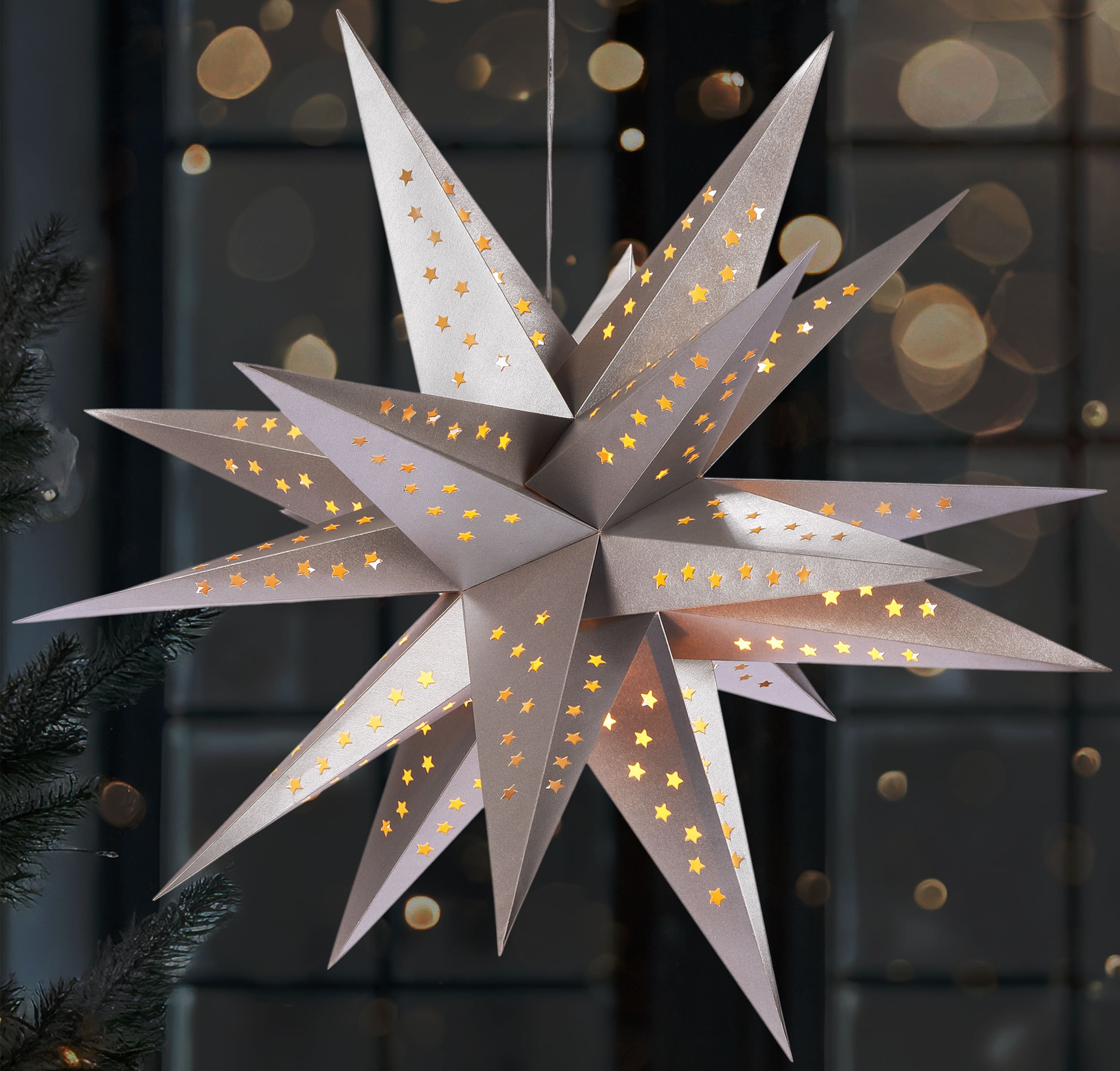 Étoile de Noël 3D BRUBAKER - 60 cm Étoile lumineuse - Fonctionne sur piles avec minuterie - Étoile LED pour décoration de fenêtre - Étoile en papier Noël, Argent