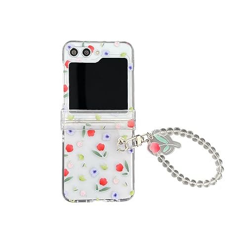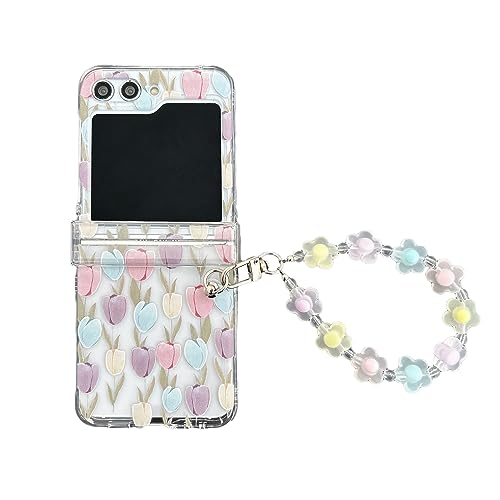 CrazyLemon Coque pour Samsung Galaxy Z Flip 5 2023, Clear Hard PC Charnière Protecteur Case avec Wristband Bracelet étui de Protective Mobile Phone Case - Tulipe