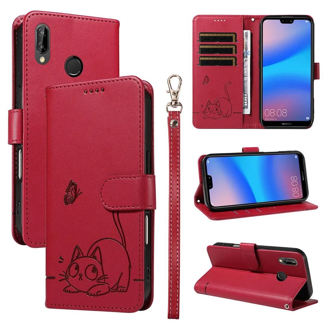 SATURCASE Coque pour Huawei P20 Lite, Chat Mignon PU Cuir Magnétique Flip Portefeuille Support Porte-Carte Dragonne Protecteur Housse Étui pour Huawei P20 Lite (ZC-Rouge)