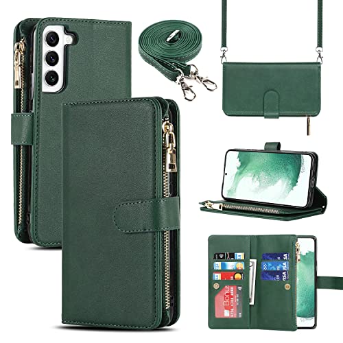 Cavor Coque Samsung S22 avec Cordon,Collier Flip Portefeuille Étui en Cuir,[9 Porte Cartes][Double Fermeture Magnétique],Housse Etui pour Samsung Galaxy S22 5G - Vert foncé