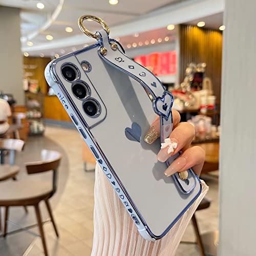 DEFBSC Etui pour Samsung Galaxy S22 Plus avec dragonne, étui de téléphone à Bords plaqués en Forme de cœur avec dragonne à Motif de cœur et Support de Doigt, étui Antichoc en TPU Souple - Bleu