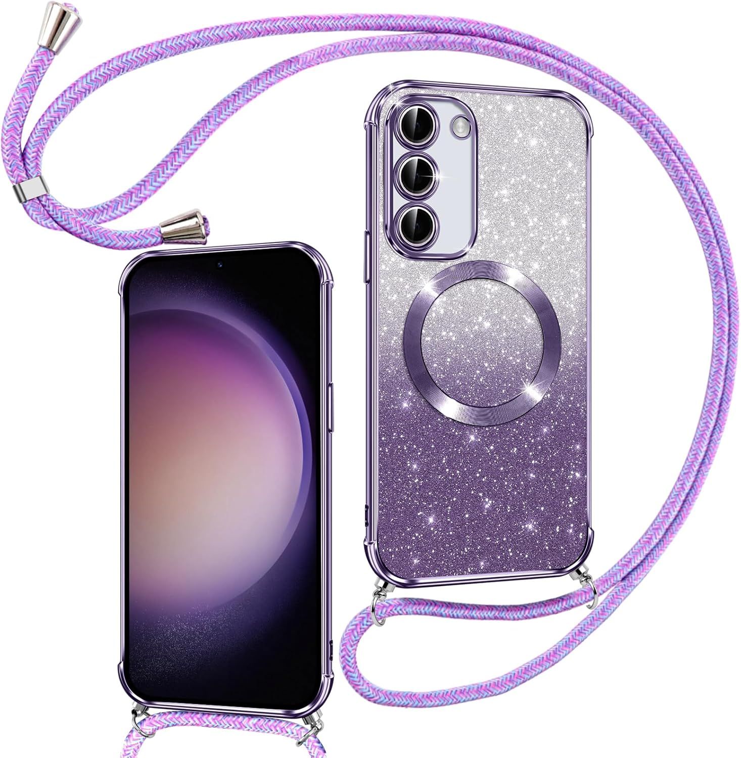 TRAHOO-Couqe Magnétique pour Samsung Galaxy S23 Plus 5G Con Cordon, Compatible avec MagSafe, Brillant Glitter Pailleté Antichoc Durable Résistante Etui pour Samsung S23 Plus 5G Bumper, Violet