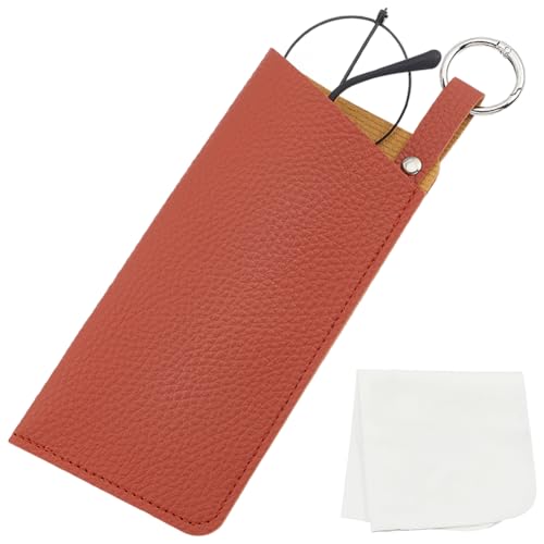 CREATCABIN Étui Lunettes Cuir Étui Lunettes Soleil Mince Portable Étui Lunettes Souple Pochette Voyage Légère avec Sangle Fermoir Chiffon Nettoyage Cadeau pour Femmes Hommes Orange Rouge 16.2x7.4cm