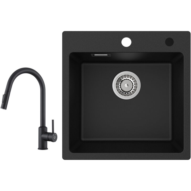 Cecipa - Mitigeur de cuisine et Evier 1 bac Set, Évier Inox 1 Cuve 50 x 45 x 19 cm avec Siphon et Trop-Plein +Robinet de cuisine Noir avec douchette