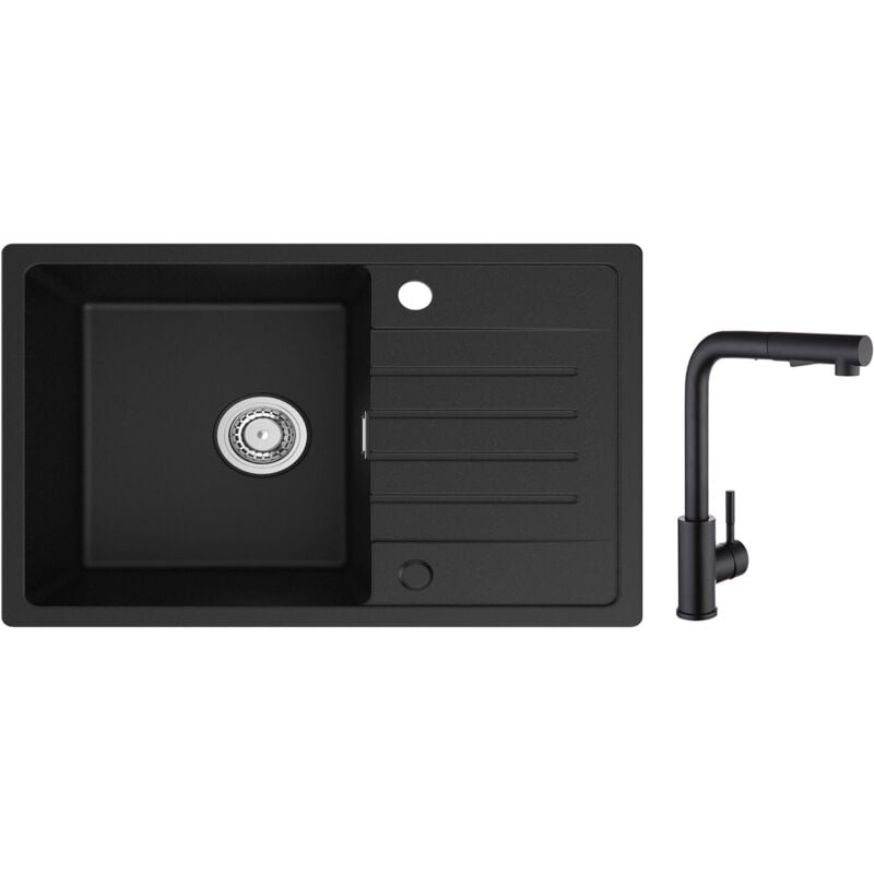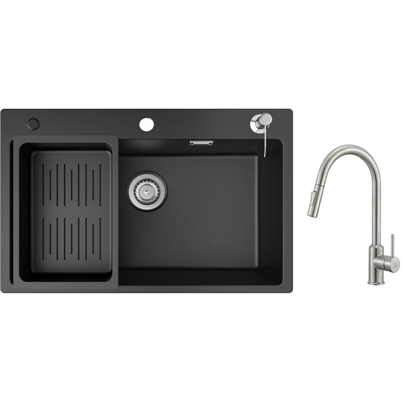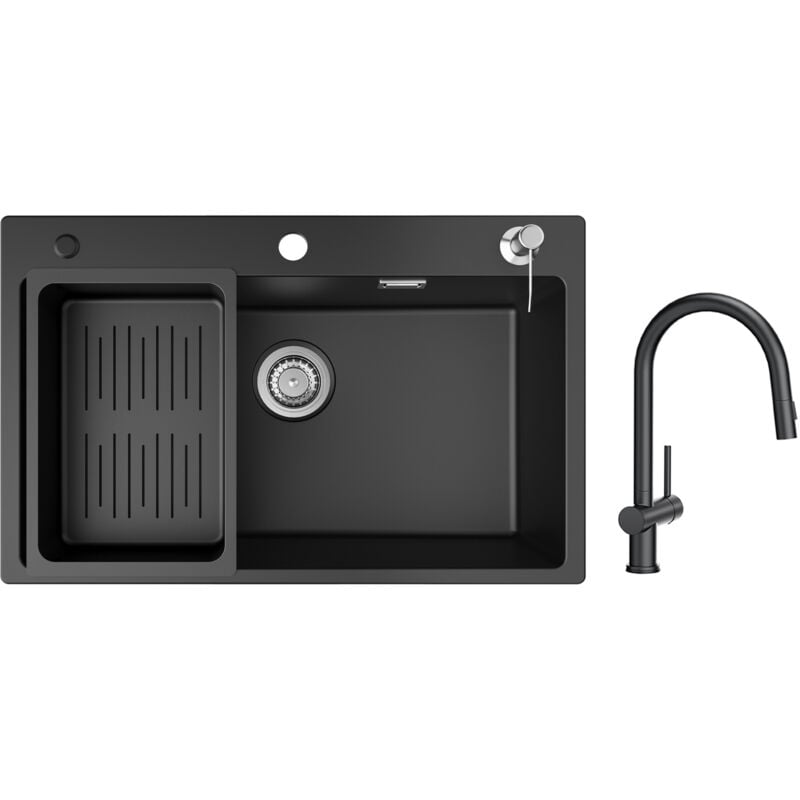 Cecipa - Evier 1 Bac avec Egouttoir, Evier de Cuisine en Quartz et Résine 78x45cm Grande Capacité Evier Noir + Mitigeur de Cuisine avec Douchette