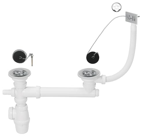 Wirquin 30721103 Ensemble complet vidage d'évier 2 bacs D60 avec siphon évier, bonde à bouchon, trop-plein et prise machine à laver, chromé, Blanc