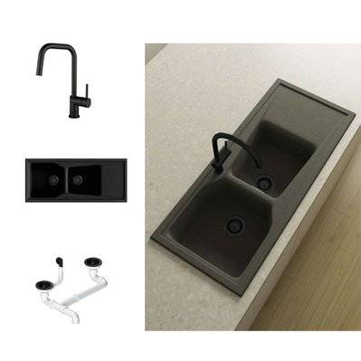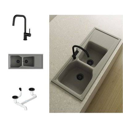 Poalgi Pack Evier 2 bacs POALGI City Ash + mitigeur avec douchette bonde noire
