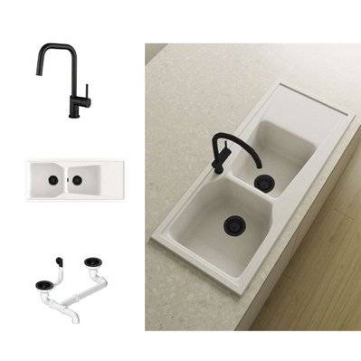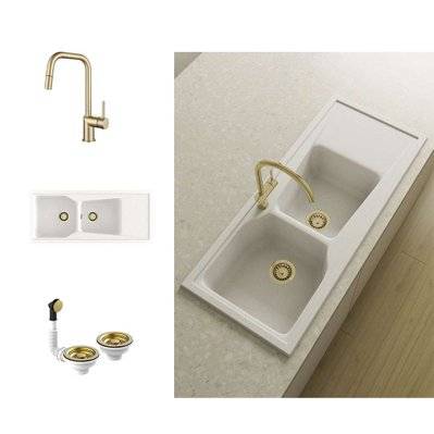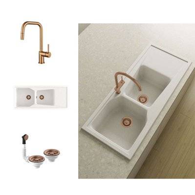 QUADRON Evier double blanc, EVAN 121 GraniteQ, Evier de cuisine, 2 bacs en granit en 1160 x 500 x 210 mm, Evier ouvert Push 2 avec siphon avec égouttoir, éléments en cuivre PVD